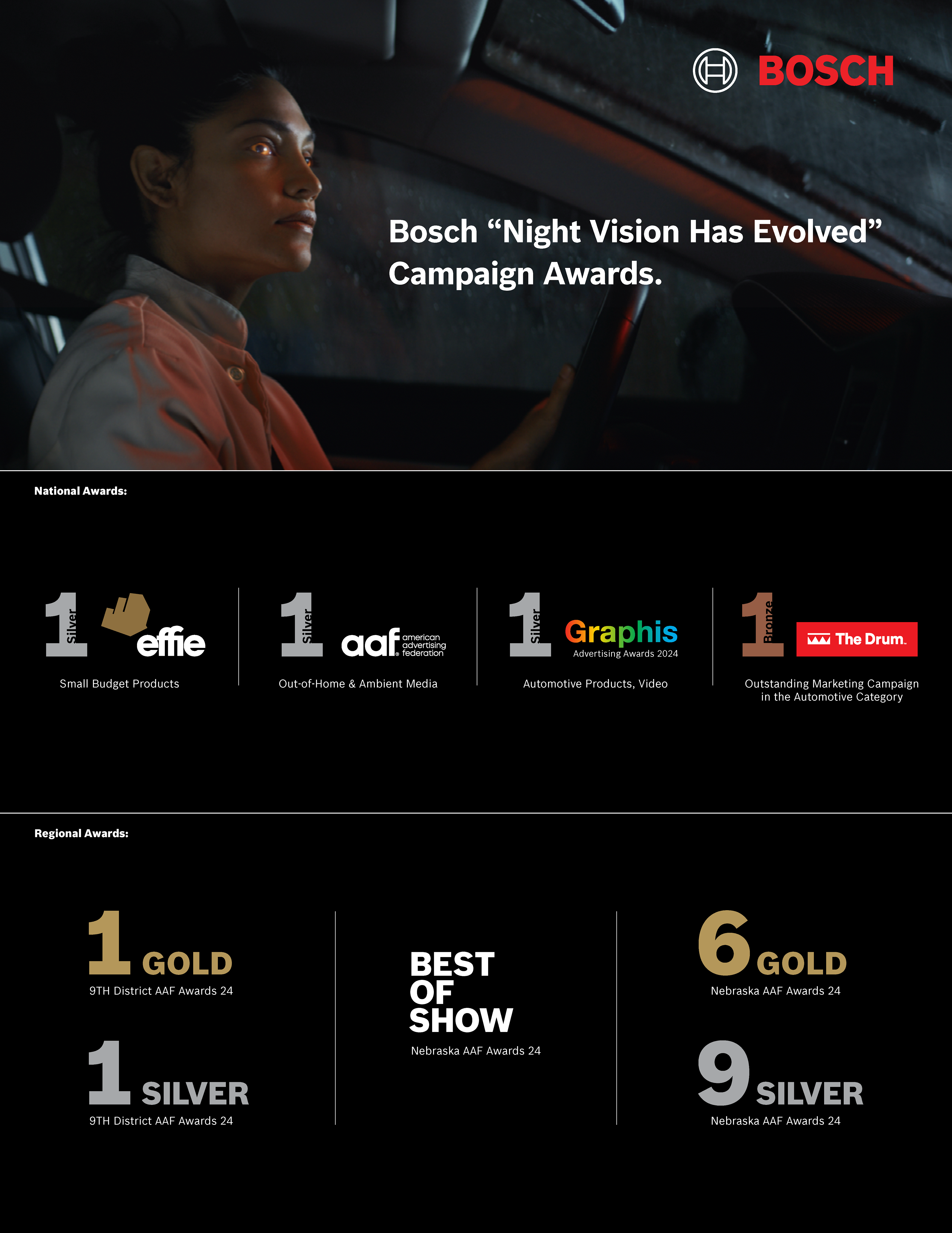 Bosch Envision and Focus Wipers reduce blur and glare, making it easier to see at night. It's an evolution for wiper blades. So we treated this as an evolution for drivers themselves, informing people that Bosch wipers are so adapted to the dangers of driving on stormy nights, it's almost as if those who drive with them are, too. We gave our drivers the eyes of nocturnal vision to show that "Night Vision has evolved."