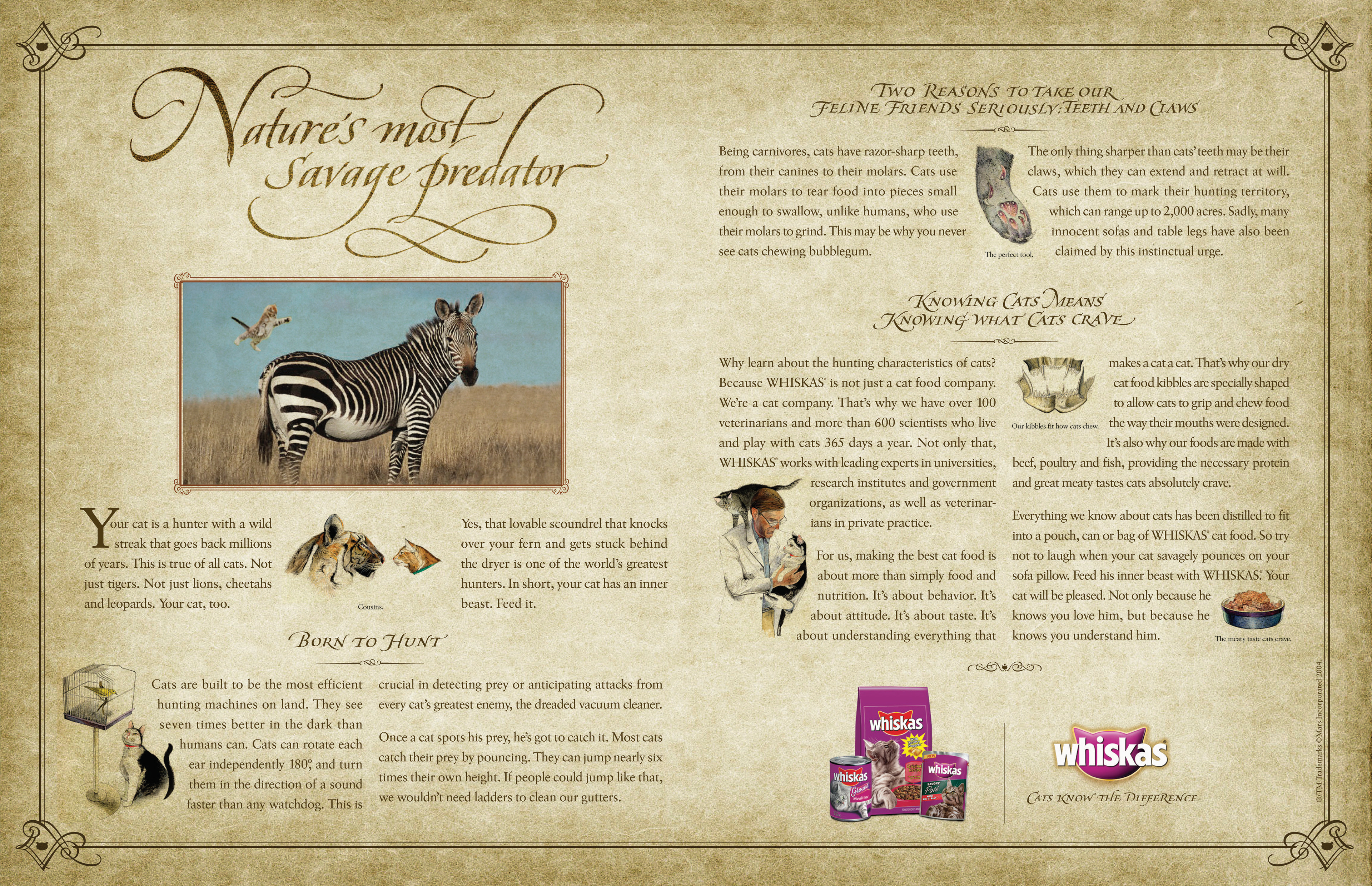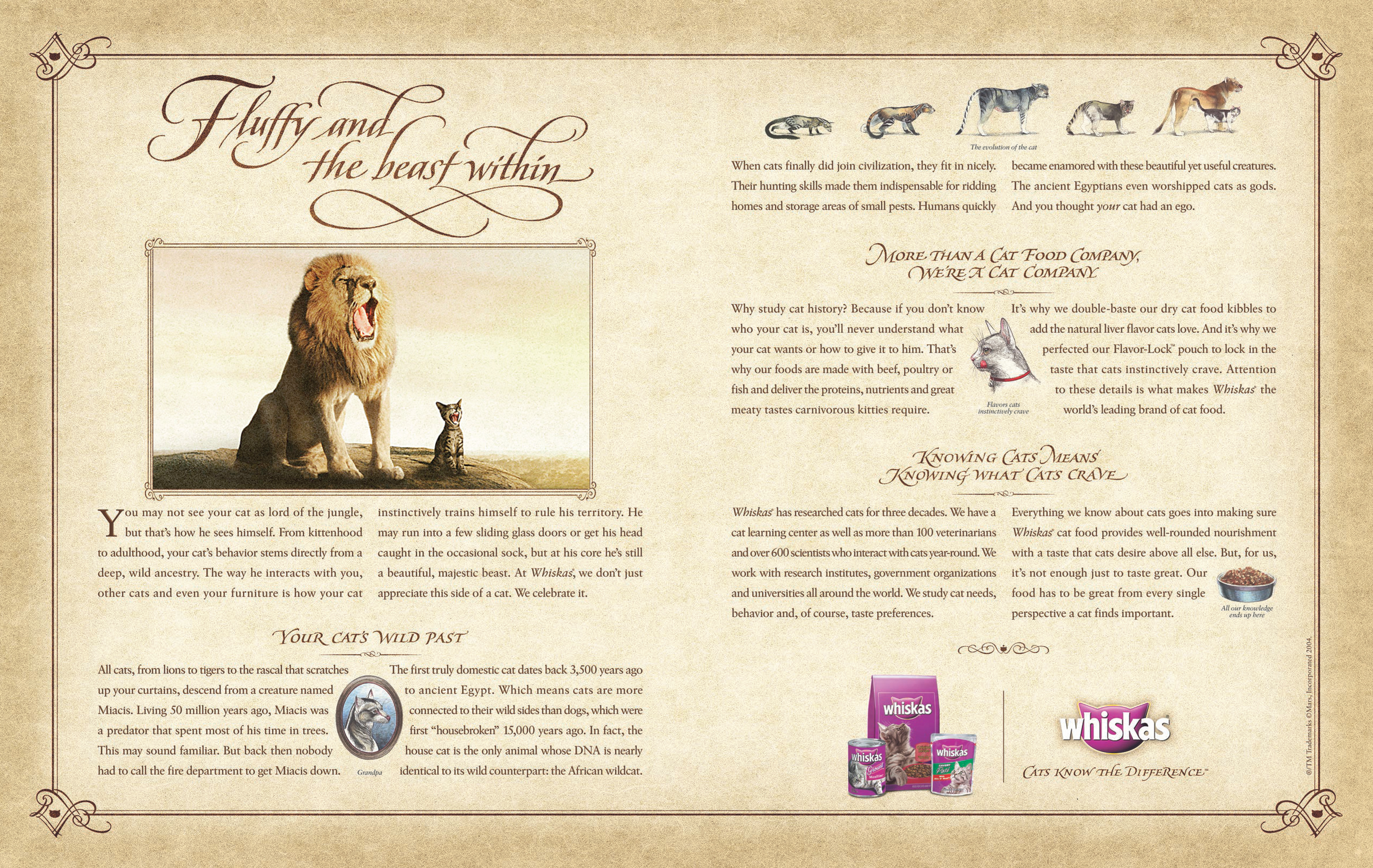 These two print spreads describe how Whiskas' research of what cats are and what cats need made the cat food company uniquely qualified to give our feline friends "What cats want." (Click to enlarge.)