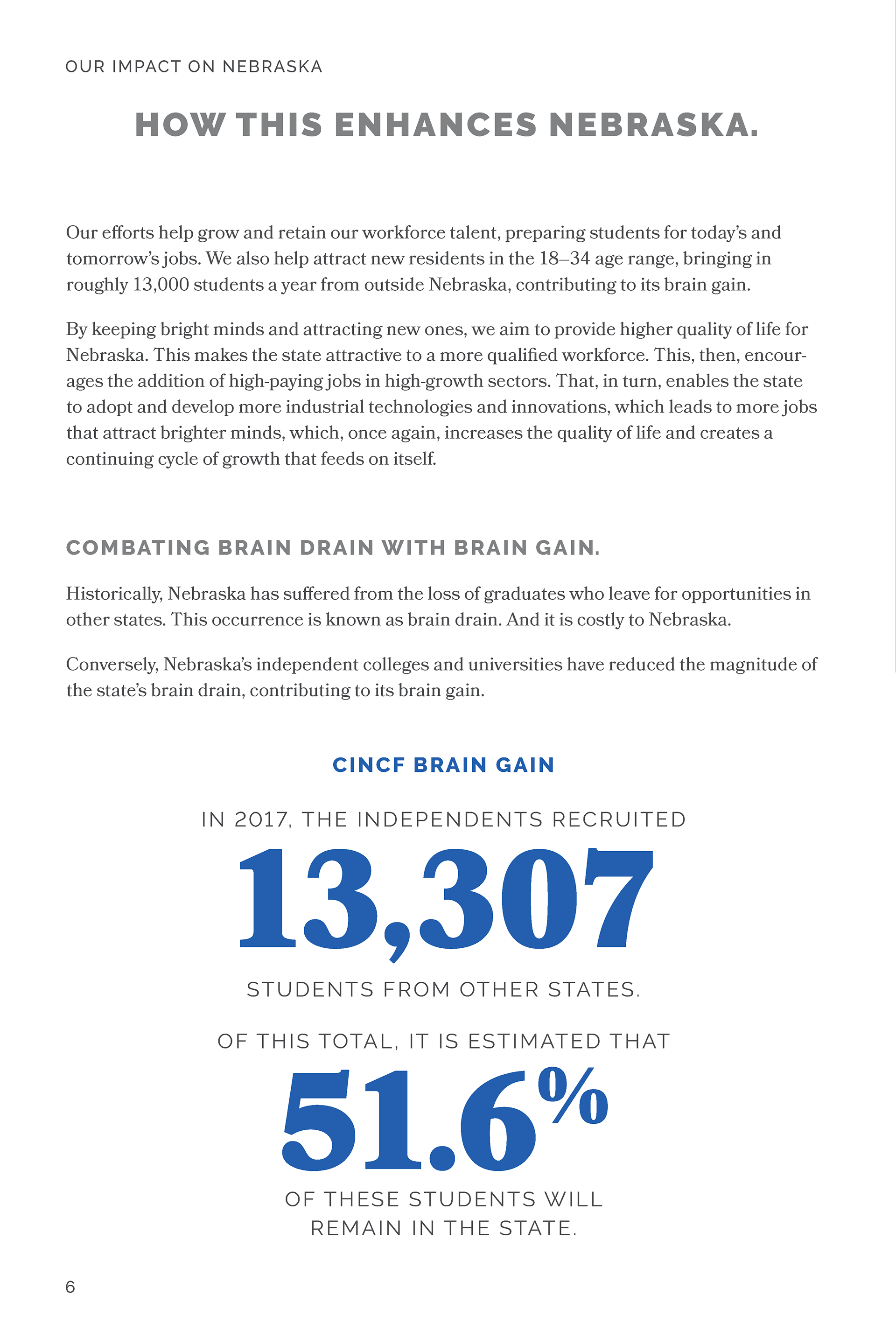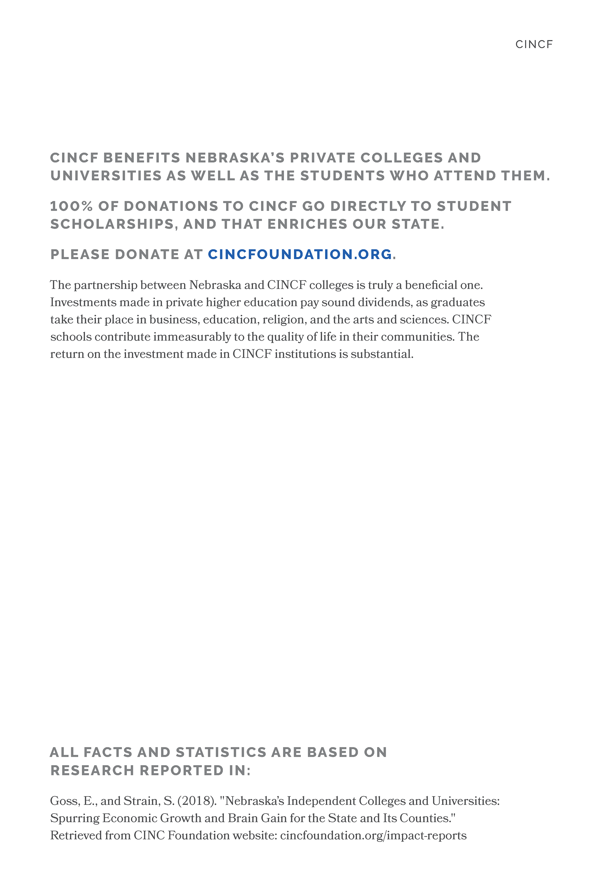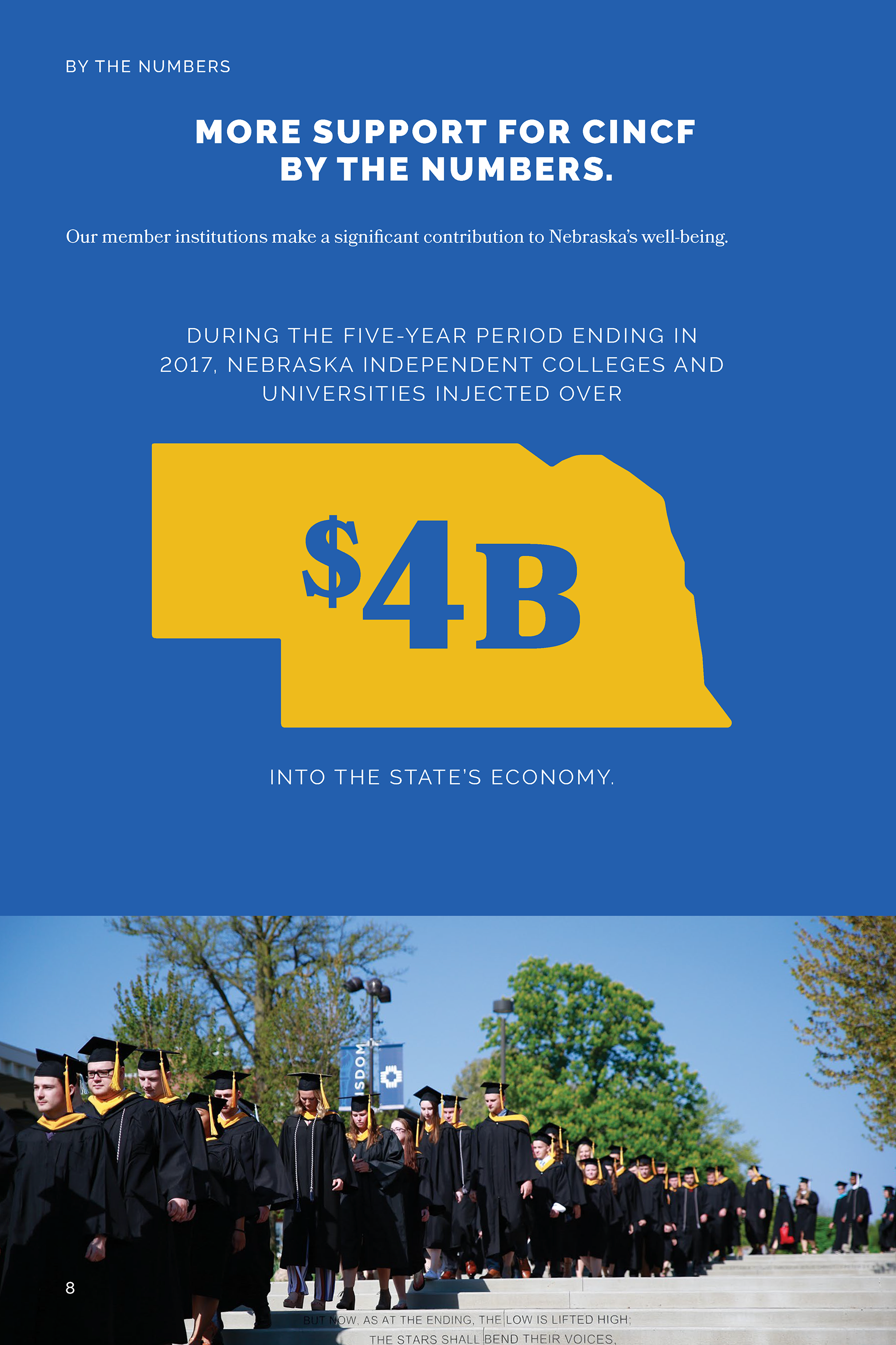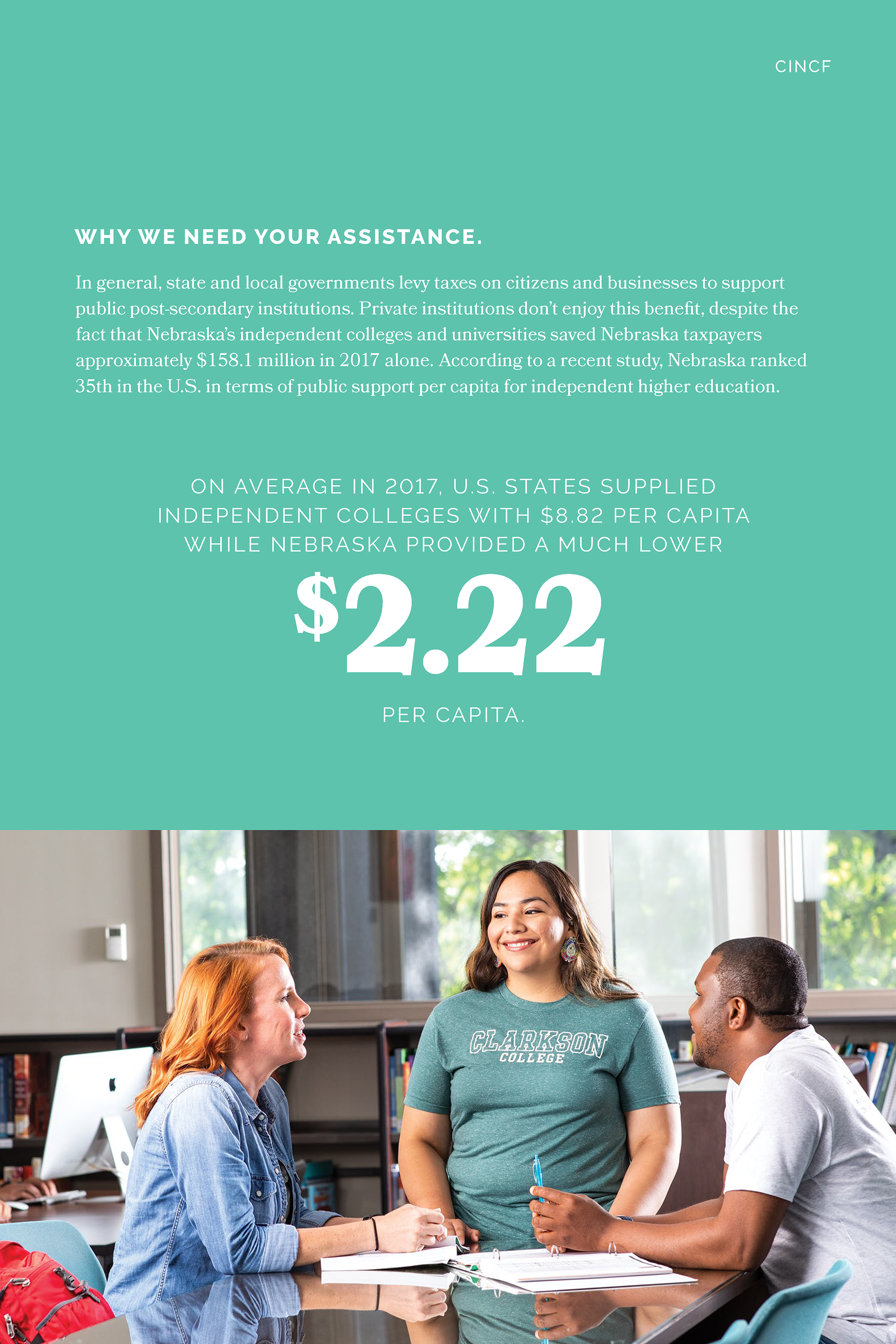 Here's a 28-pager asking Nebraska organizations to donate to private Nebraska colleges. It gives in-depth details on how investing in CINCF benefits both the students and Nebraska's economy. (Click to enlarge.)