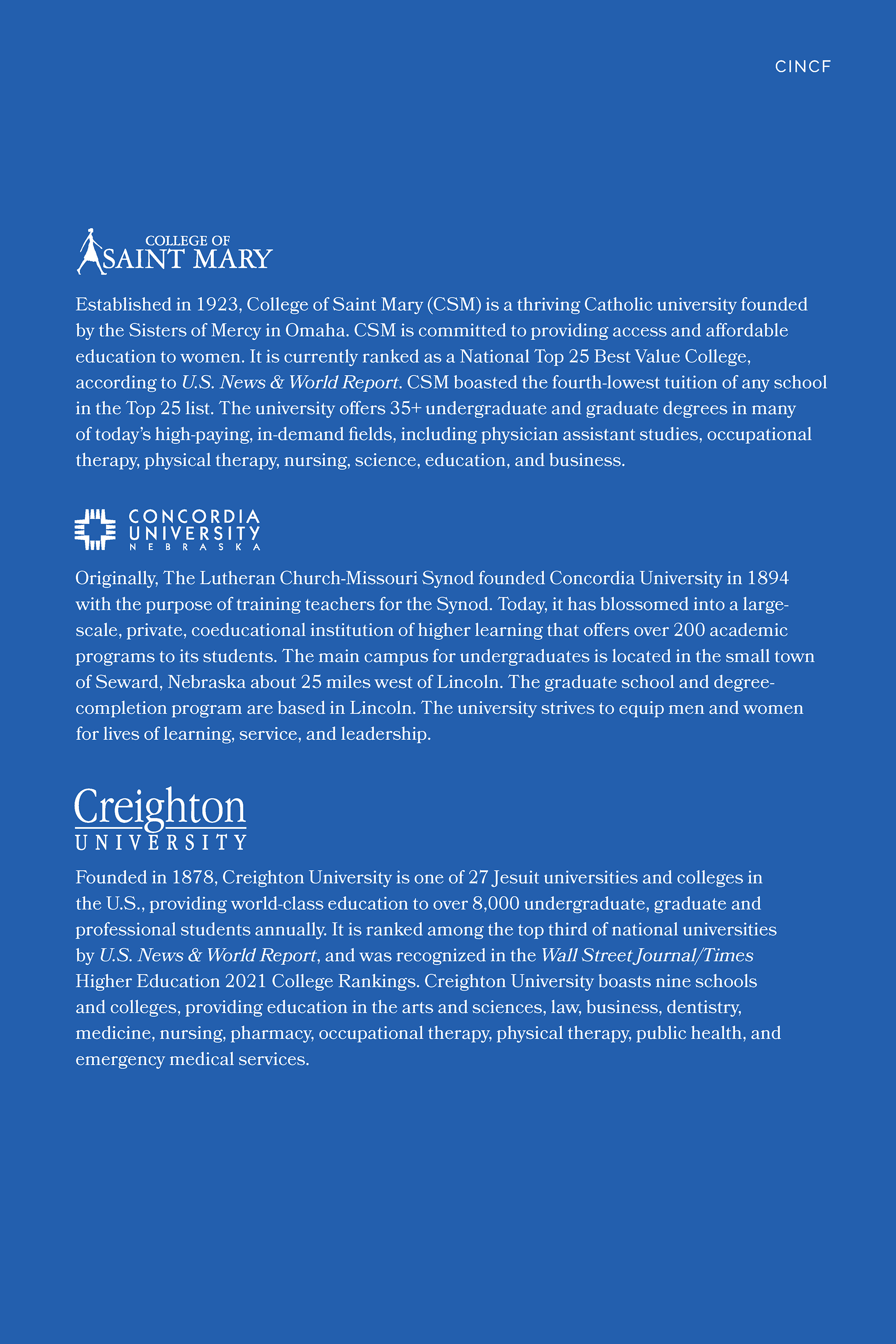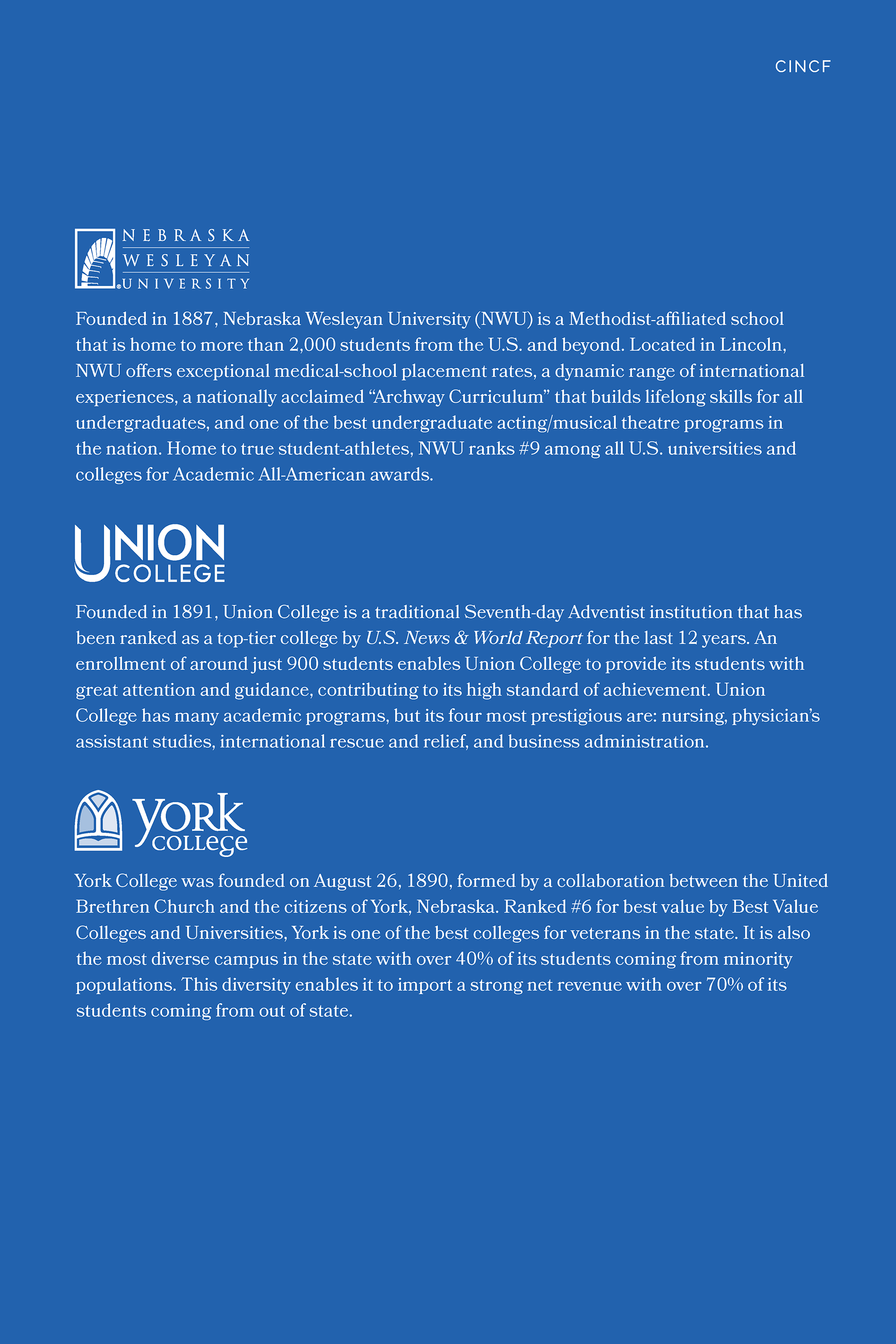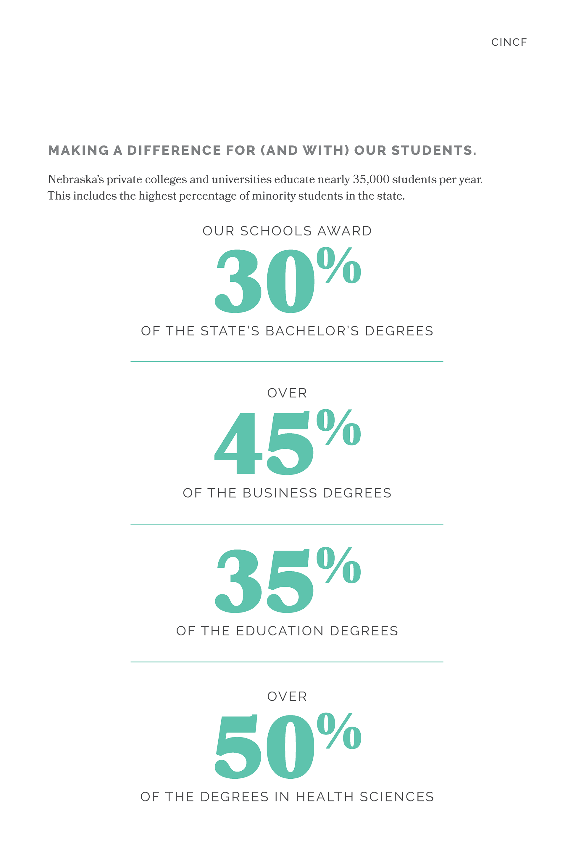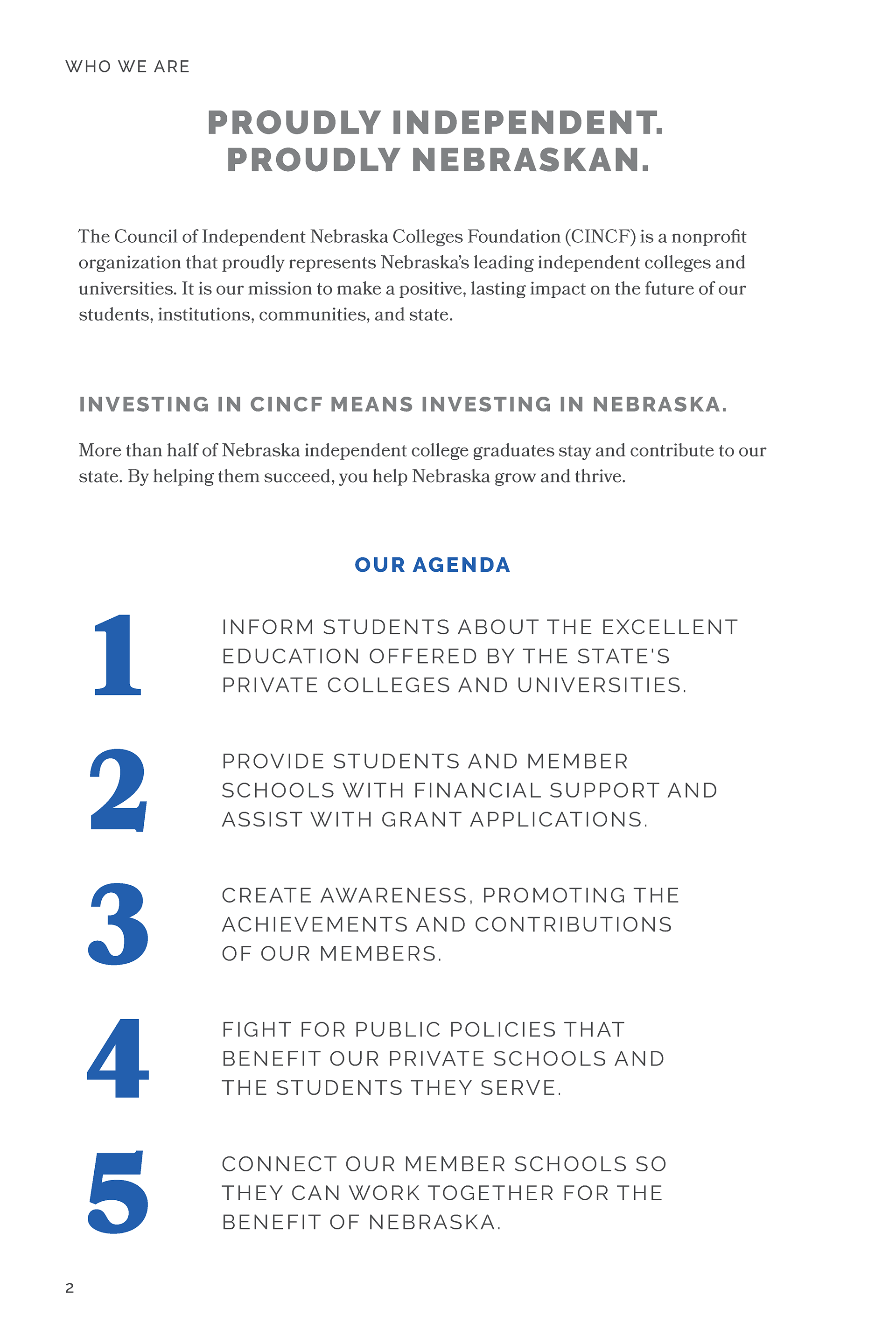 Here's a 28-pager asking Nebraska organizations to donate to private Nebraska colleges. It gives in-depth details on how investing in CINCF benefits both the students and Nebraska's economy. (Click to enlarge.)